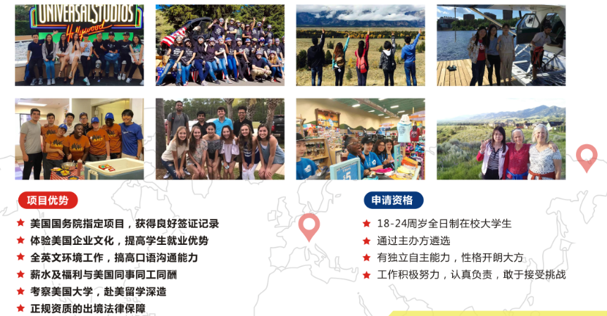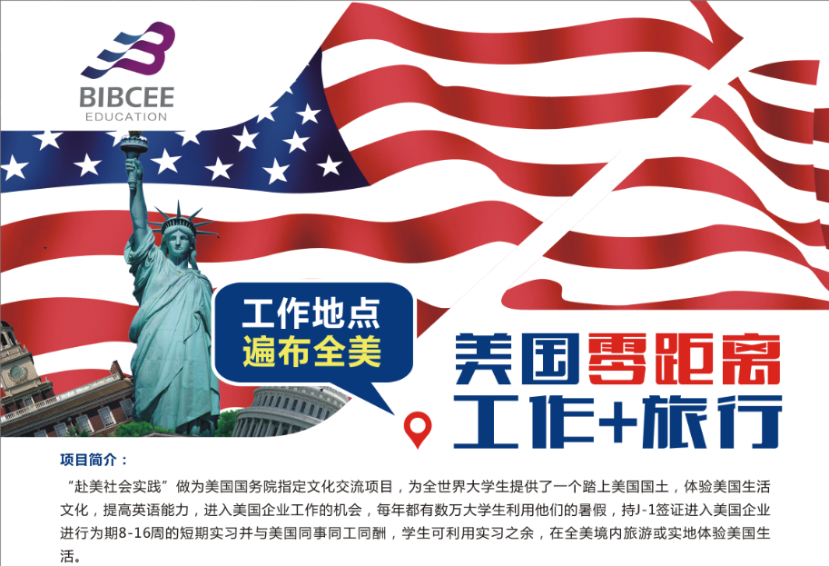 赴美社会实践,即Summer Work & Travel USA,基于美国政府于1948年通过的信息及教育交流法案(Smith-Mundt Act),该法案为交流访问项目建立了基本框架。此法案于1961年被纳入并扩展为教育及文化平等交流法案(Fulbright-Hayes Act)。项目在中国大陆推广之前,已经在欧洲、美洲及亚洲其他国家和地区成功运作了40余年,每年都有数万学生利用他们的暑假,持J-1签证进入美国企业进行为期12~16周的短期实习。项目的特点在于为全世界大学生提供了一个踏上美国国土、体验美国生活文化、提高英语能力、进入美国企业,与美国同事以及来自其他国家实习生并肩工作的机会。此外J-1签证让每个实习生在完善的美国劳动制度保障下进行实习工作,与美国同事同工同酬。