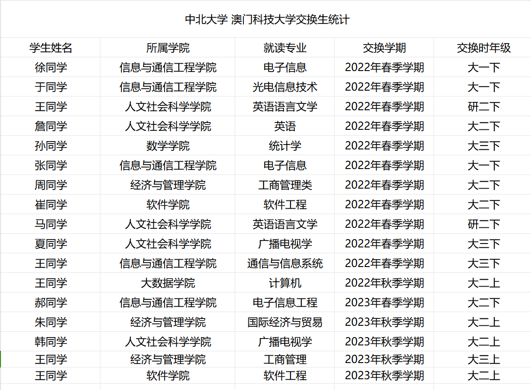 2022年秋季--2023秋季,中北大学已经选拔信息与通信工程学院、人文社会科学学院、软件学院、经济与管理学院等学院共计17位优秀学生,赴澳门科技大学进行交流。以上学生均理想的完成交流期间的教学任务,并已返回中北大学继续学习生活。
