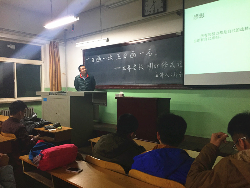 1月4日晚,中北大学2014届毕业生,同年全奖入学美国普渡大学硕博连读的郑伟建学长为我院同学带来了题为“十日画一水,五日画一石——世界名校offer修成记”的演讲。