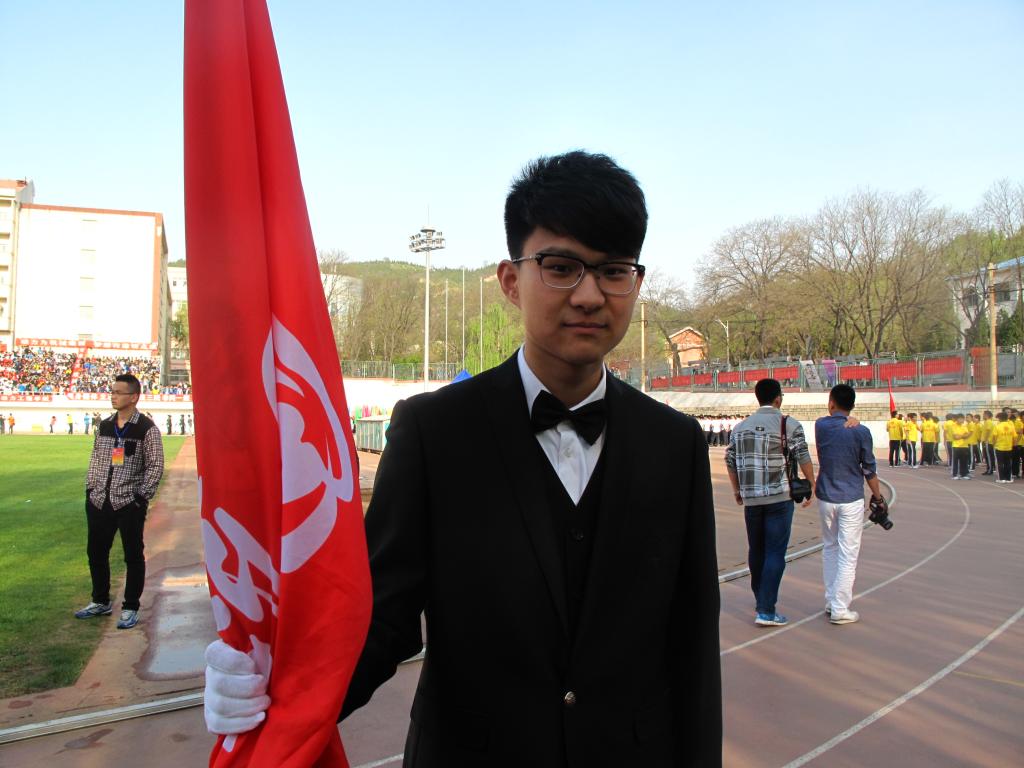 作为一名旗手,他也是一个新手,但他虚心学习,训练时从不懈怠。“这是一份光荣而艰巨的任务,我要争取展现出最好的自己,走出我们该有的风采,为学院争光。”当我们向他提问第一次担当旗手的感想时,他这样回答我们,带着一丝小小的紧张,但更多地流露出他对这项任务的期待和信心。是的,旗手肩上的旗是学院的标志,旗手的精神面貌也直接影响到整支队伍的精神面貌。但有这样一个稳重的旗手,我们的方队又有何担忧?