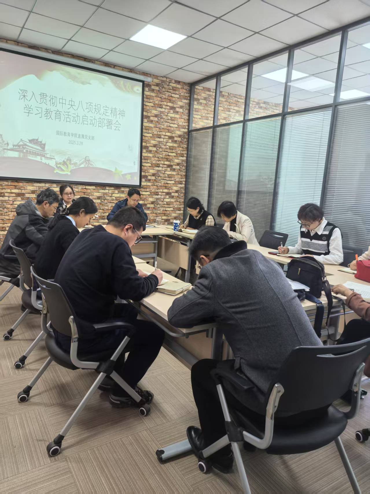 根据校党委《关于在全校开展深入贯彻中央八项规定精神学习教育的工作方案》的通知(党发〔2025〕8号)文件精神,召开深入贯彻中央八项规定精神学习教育动员部署。2025年3月28日上午,国际教育学院直属党支部在学院会议室603室,系统部署全院深入开展中央八项规定精神学习教育工作,学院领导班子及全体党员参加会议,会议由院书记李京主持。