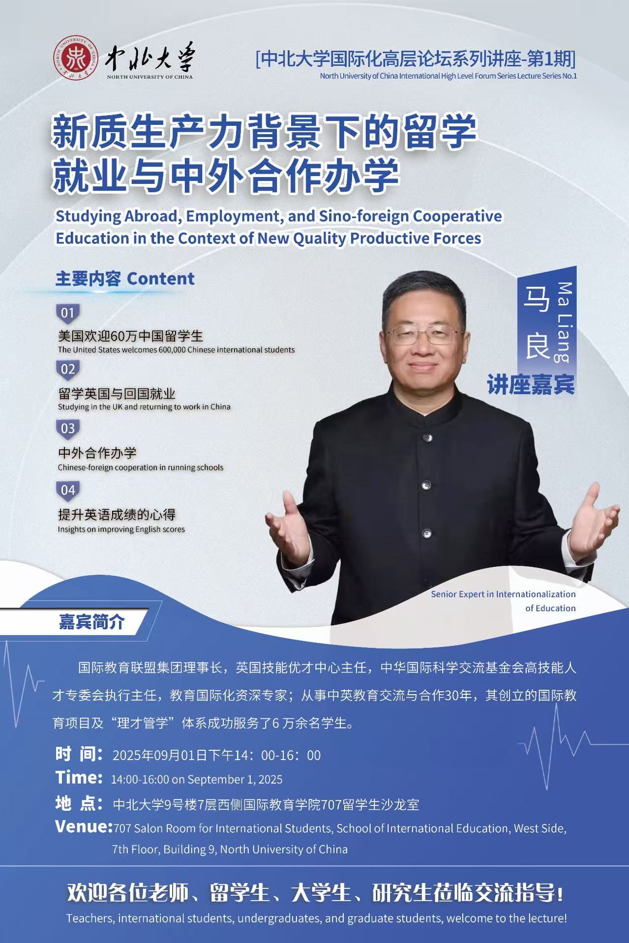 本次讲座为中北大学国际化高层论坛系列讲座的第1讲,后续将陆续推出师生国际流动、科研国际合作等国际教育交流合作相关主题的专题讲座,敬请关注。