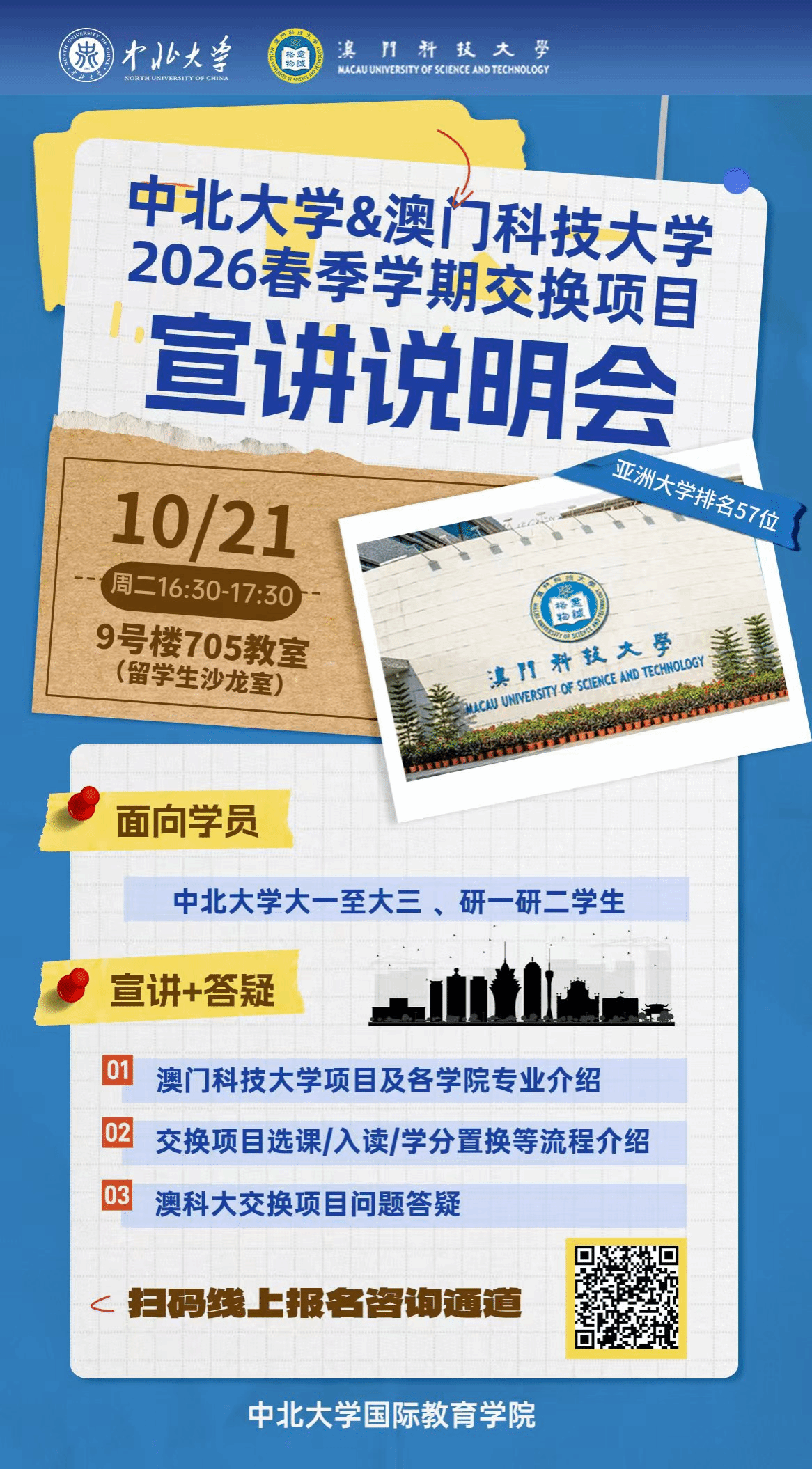 中北大学与澳门科技大学2026年春季学期交换项目(第九期)已开放申请报名。为使更多的同学了解项目具体情况,现决定面向全校非毕业班同学开展项目说明会,具体通知如下: