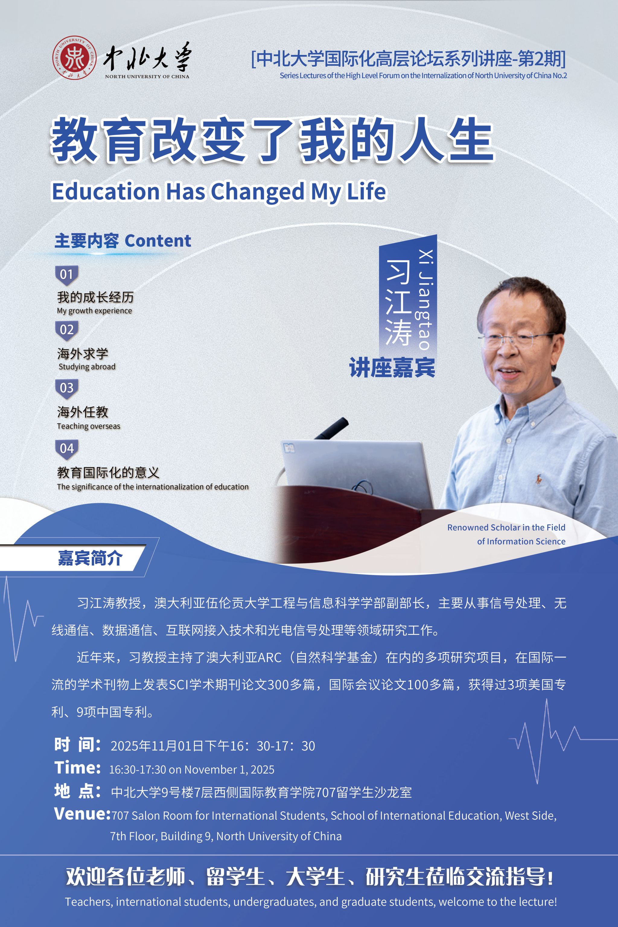 本次讲座为中北大学国际化高层论坛系列讲座的第2讲,后续将陆续推出师生国际流动、科研国际合作等国际教育交流合作相关主题的专题讲座,敬请关注。