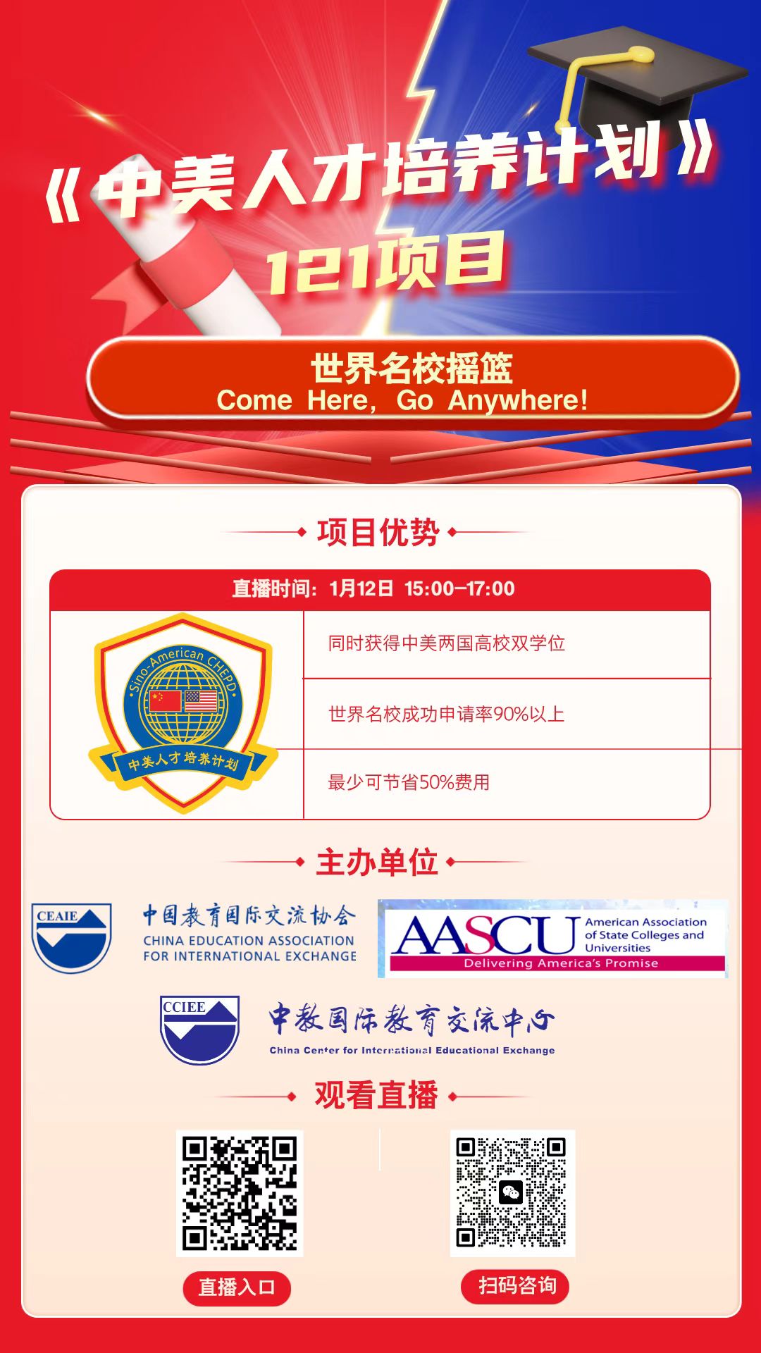 《中美人才培养计划》121项目宣讲会将于2025年1月12日下午15:00——17:00进行线上直播,请有意向的同学按时扫码收看,直播入口和咨询群组二维码见下图: